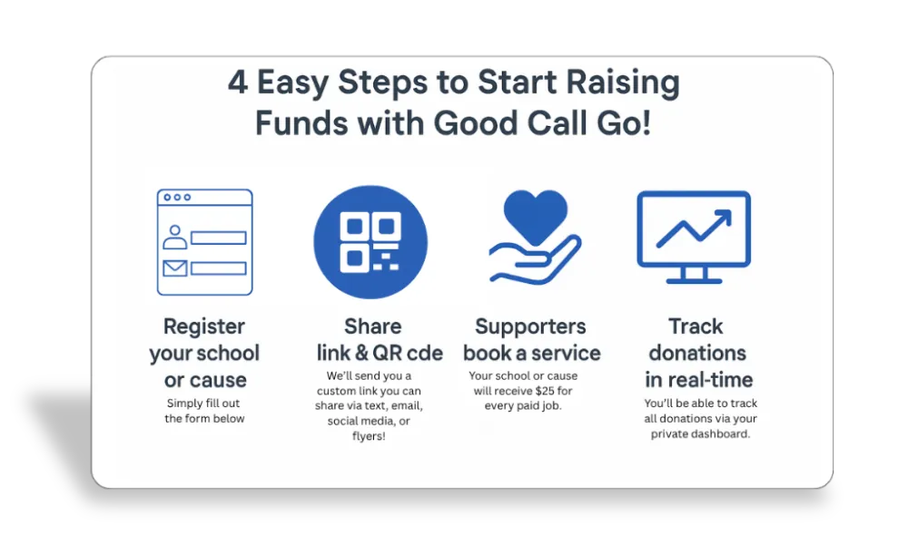 Every call is a cause, and now your school or group can turn everyday services into school or community funding. Your unique link and QR code will be on the way shortly—share them anywhere your supporters gather, online or offline.
